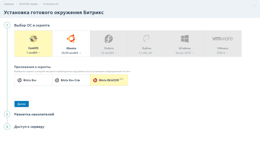 Выберите стандартное Bitrix Env или окружение от EKACOD. При необходимости подключите предложенные опции.